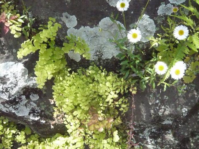 石と石の隙間からいろいろな植物が元気よく顔を出しています。